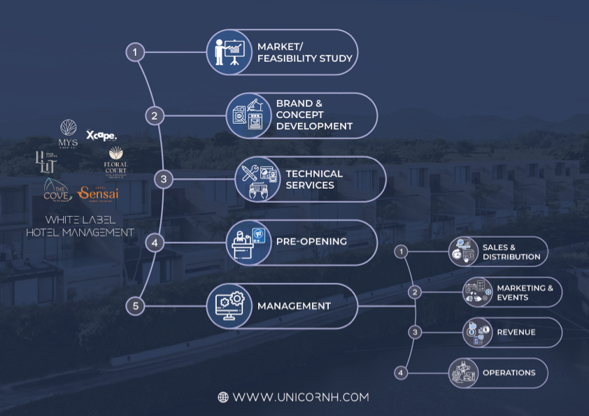 Our white label management service allows you to maintain your hotel's independent identity while benefiting from our expert management and operational support. UNICORN Hospitality's experienced team will oversee all aspects of daily operations, implementing proven strategies and best practices to ensure optimal performance, guest satisfaction, and financial success.